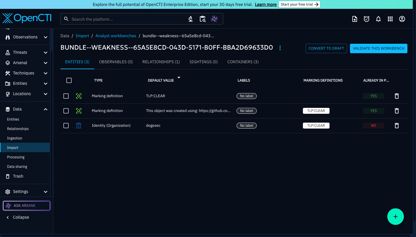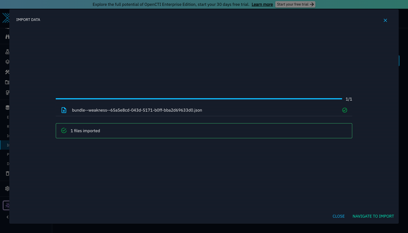 I am trying to pull CWE data into OpenCTI using the API. To simplify what is going wrong, I will describe it using a bundle upload to OpenCTI directly because it results in the same problems.
